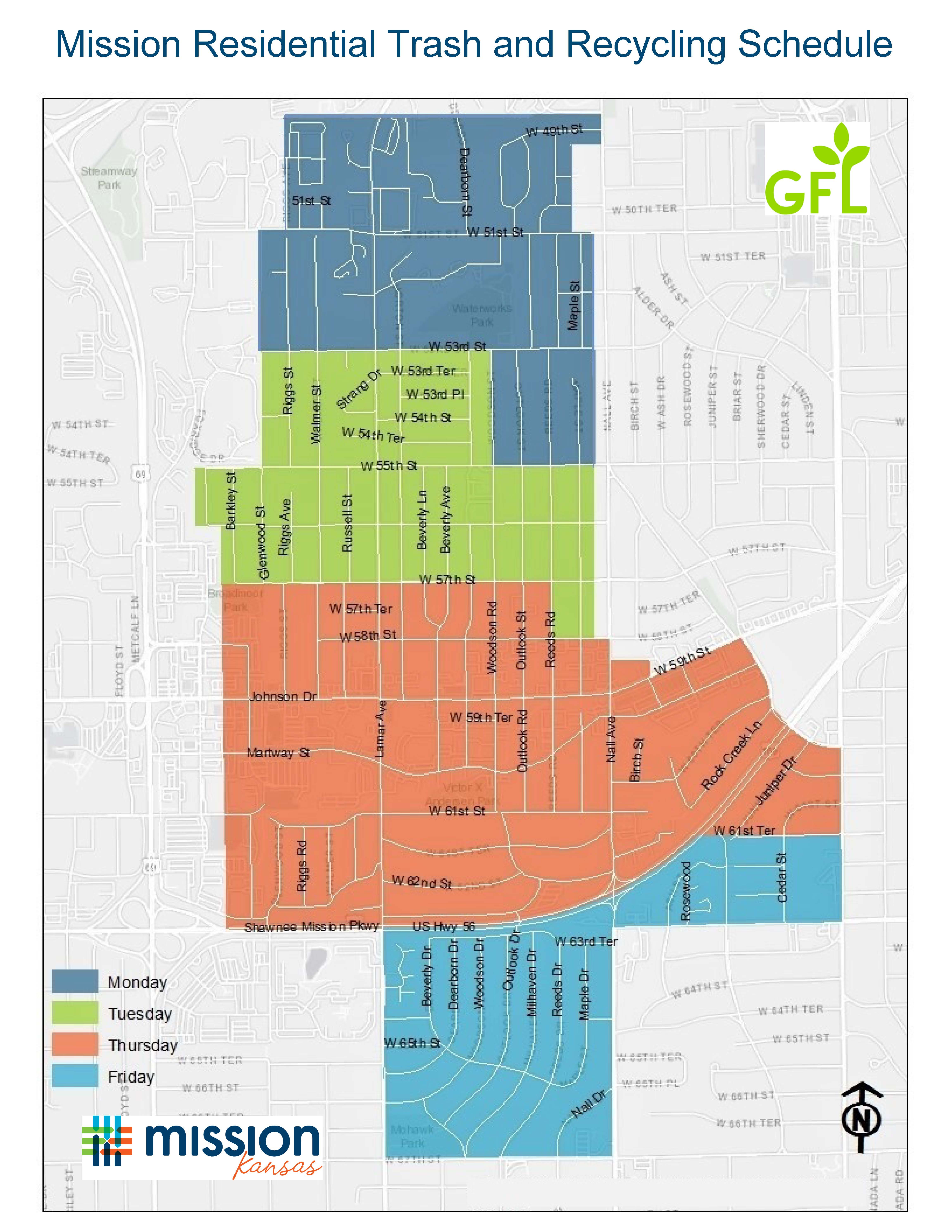 You do not need to start or stop service since the trash collection is automatically set up through the City contract with GFL. You will not receive a bill, but a portion of your annual tax bill is dedicated to paying for this service under our Solid Waste Utility fee. Service includes weekly curbside pick-up of trash, recycling, yard waste, and monthly bulky item pickup from single-family residences. Click here for a map that shows trash pickup days.
